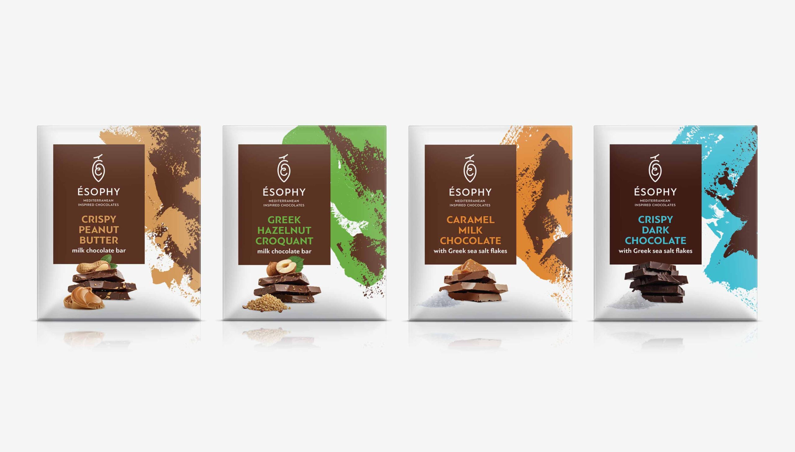 Packaging design for a new series of chocolate bars for ÉSOPHY Chocolates. The objective was to create a new chocolate bar line that delivers ÉSOPHY’s signature quality at a more accessible price, clearly differentiating it from the company’s premium range while maintaining a distinct and consistent color code for each flavor.